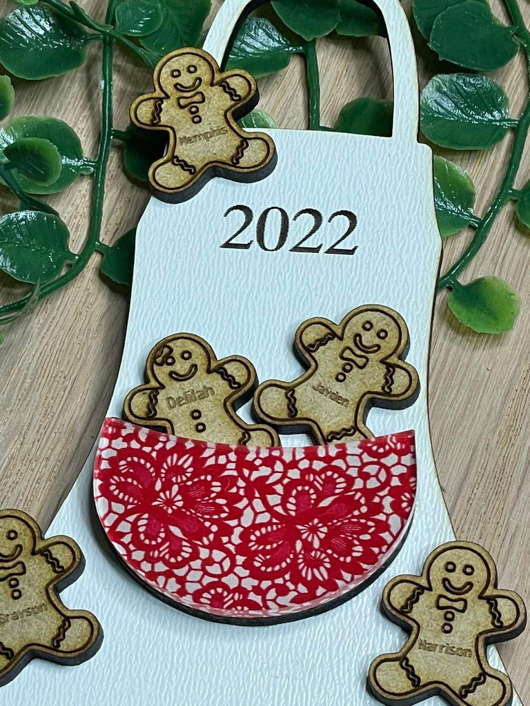 Grandma can be changed to any name. Can add up to 8 gingerbread cookies. Apron measures 3.5”x 6” long.